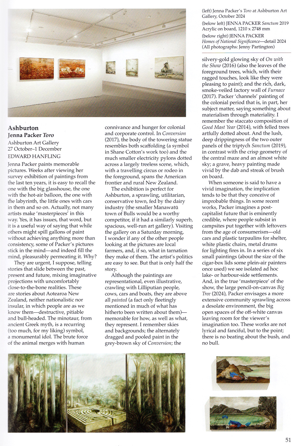 Art New Zealand, #193, Autumn 2025 Edward Hanfling reviews Jenna Packer’s exhibition Toro at Ashburton Art Gallery in October, 2024 Packer imagines a post-capitalist future that is eminently credible, where people subsist in campsites put together with leftovers from the age of consumerism – old cars and plastic tarpaulins for shelter, white plastic chairs, metal drums… View more
