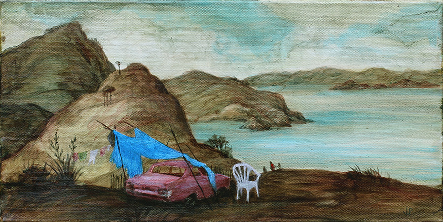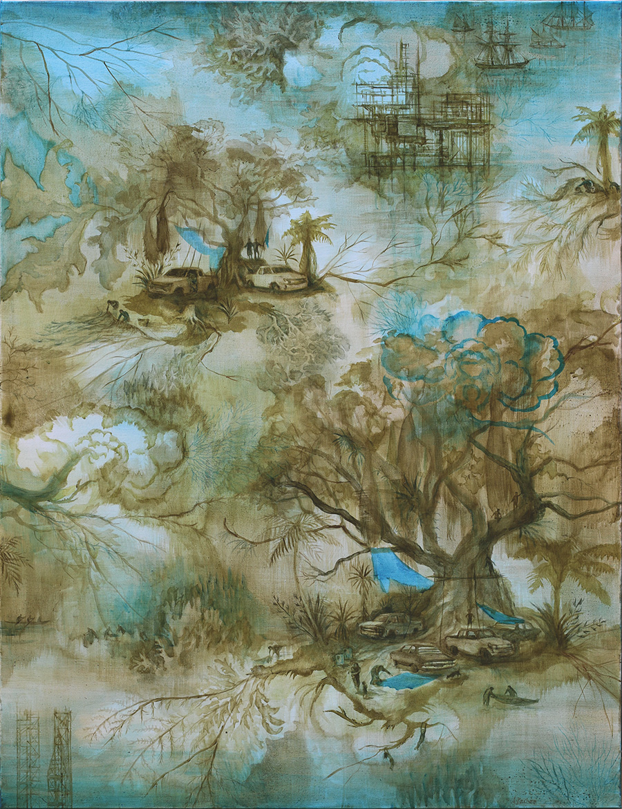 Jenna Packer had been looking for a way to reference Toile de Jouy, printed fabrics from the 18thC, since working in costume in France many years ago. Meantime, meditating on the climate crisis had pulled her towards the notion of cognitive dissonance, ie. the normalising of future forecasts and current hardships to a point where these become as wallpaper to our lives, an irritating vibration. In this form we can thus ignore them. “These paintings aren’t just as a critique of society in general, but a sort of open confession. I want the beauty and the ability to go about my life and find joy, while at the same time I feel overwhelmed by the knowledge that I hold.” Sailing ships, oil rigs and marooned cars float on a blue and sepia field in the two large paintings in this exhibition. The smaller works are set in Augustus Earle colonial landscapes from the 1820’s. Jenna Packer lives and works in Dunedin and has exhibited her lush paintings and delicate prints throughout New Zealand since graduating from Ilam School of Art in 1988.