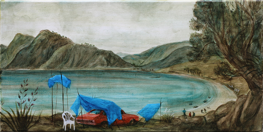 Chris Pole “These two works evoke the different moods evident at disparate locations. Mangawhai on the east coast of the North Island comes with crashing waves running across sand bars and filling tidal pools, the dark slick of water rushing over, around, and through textured rock formations. A more gentle meeting of the ocean and the shore occurs in Dryden Bay, a remote inlet in the South Island’s Marlborough Sounds. The water lapping at the vertical bush maintains a stillness and tranquility inherent to this quiet corner of our coastline.” Chris is a keen outdoorsman and often has his camera with him. The shots he takes become the starting point for re-envisioned landscapes. His brushwork is textured and the paintings are executed with detailed care. He disrupts this intimacy with slices that slide one set of rocks against another, as if tectonic plates had abrupty moved. In this way he reveals the vagueness of human perception and implies change and fragility. Chris Pole has been exhibiting since 2002, most recently at Ashburton Art Gallery with Crooked Spur an installation of paintings with video and soundscape.