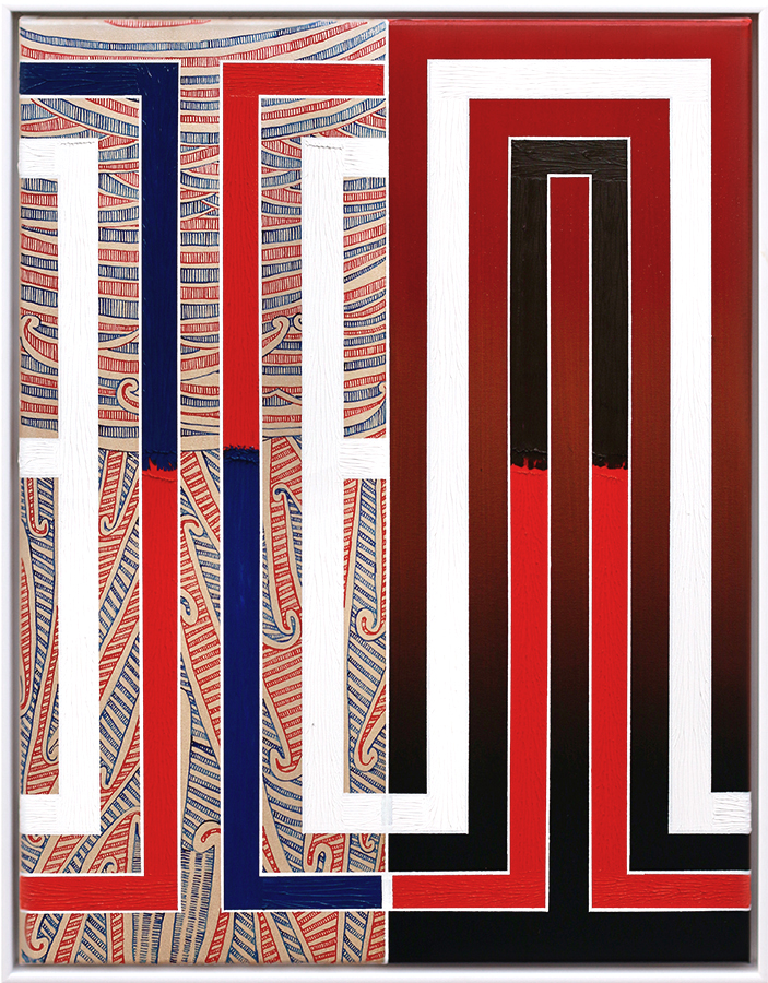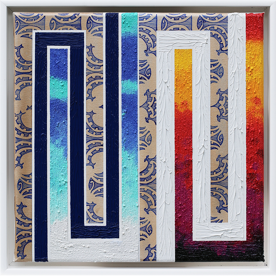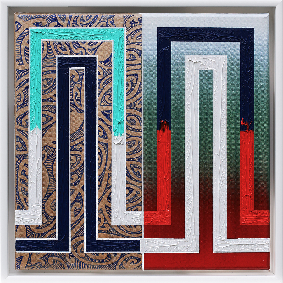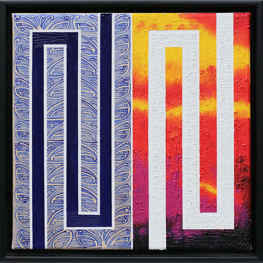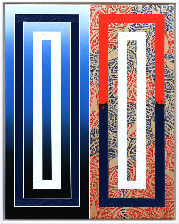 The title of the show ‘Mihi’ translates as ‘tribute’ and each work is named after an important person in the artist’s life. Darryn George’s dynamic yet serene Tribute paintings are respectfully dedicated to hidden leaders: “A big part of the stories and art of Māori culture is acknowledging those that have gone before us; those people from our past who have had an influence upon us. For me, these lovely people whom the paintings are named after, often went under the radar, but for me the seeds that they sowed were significant.”