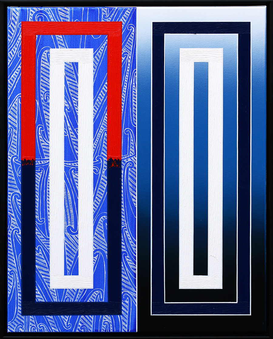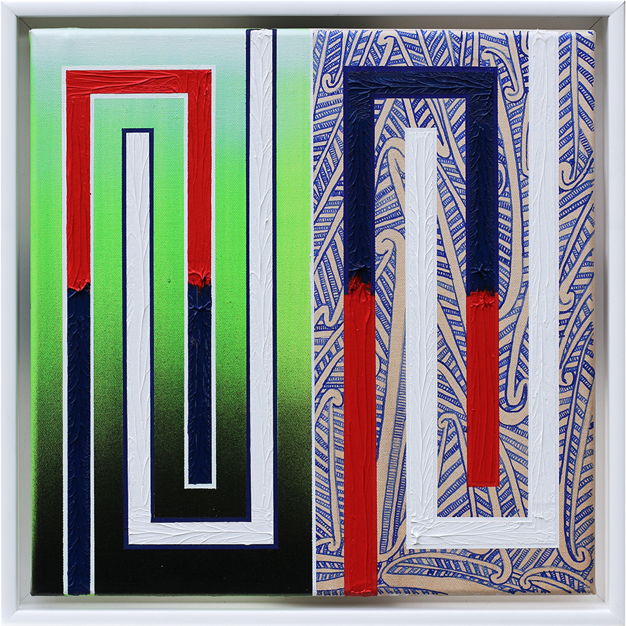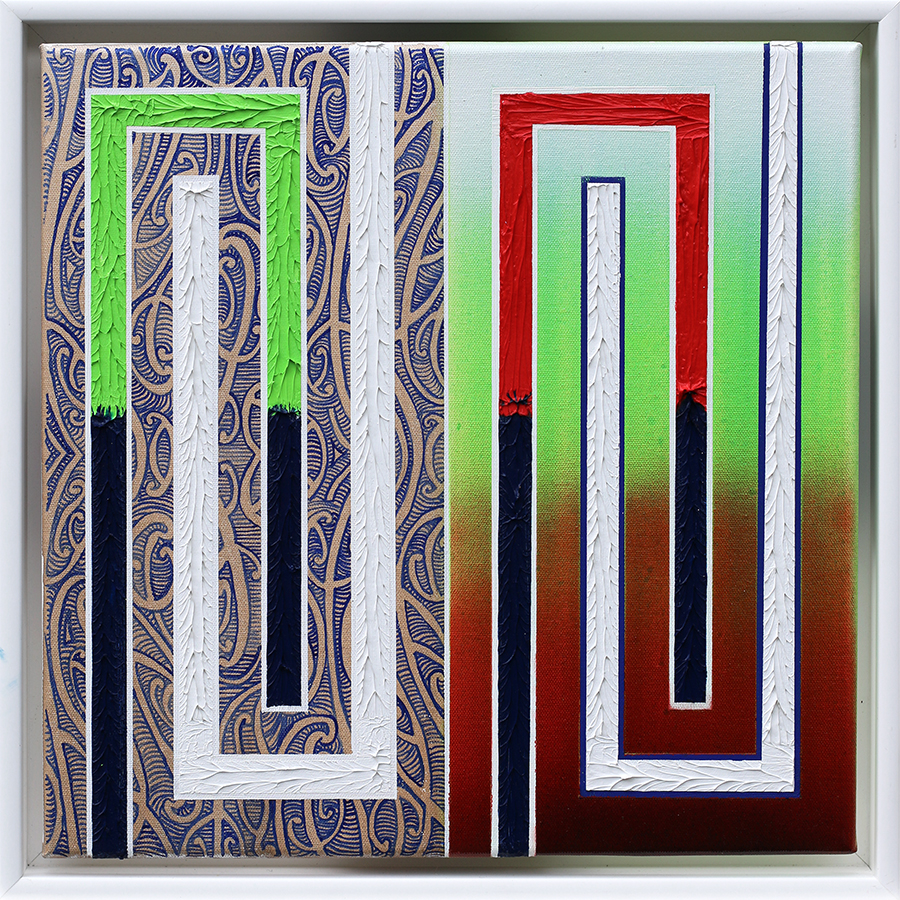 Born and based in Ōtautahi, acclaimed artist Darryn George is of Ngāpuhi descent. His paintings reflect the breadth of his cultural roots, finding their anchorage in his Christian faith and his Māori heritage. He has primarily worked with geometric abstraction, often executed with immaculate finish, but over the past few years tones have undulated, texture has increasingly replaced smoothness, colours have brightened, illusory space has been suggested and abstraction has even given way to loose figuration. By pushing the boundaries of his methodology – particularly in the recent Garden of Eden series which were drawn in bright pastel across vibrant white canvas – he has opened the door to creative expansion and a new direction.