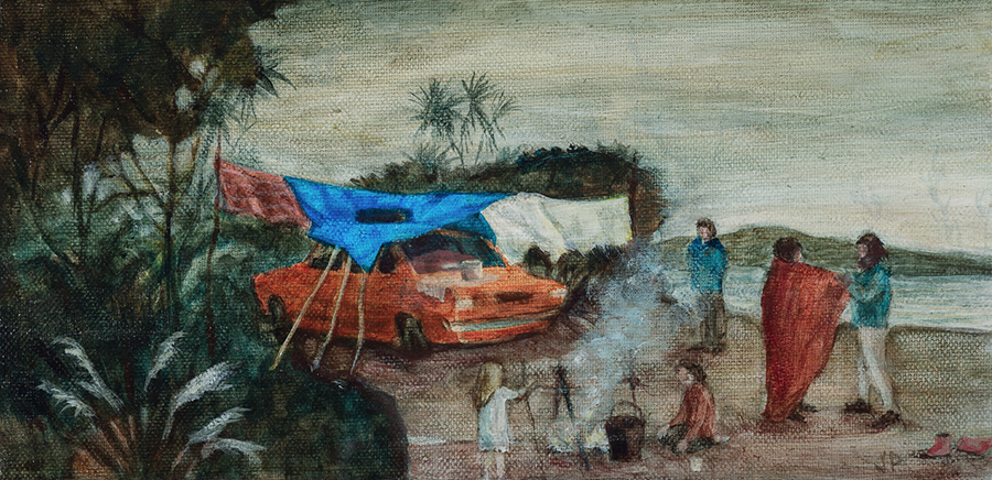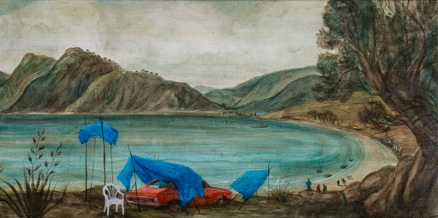 It could be a post-capitalist future, or just post-flood, post-displacement, ‘speculative fiction’ (like writers such as Kim Stanley Robinson use to explore possible future scenarios) with details that anchor us firmly in the recognisable present. Some specific details are from sketchbooks drawn while living in France in marginal communities, anti-globalisation encampments and makeshift car and tarpaulin bivvies for seasonal work. Some figurative elements were found online: the proliferating refugee camps in many parts of the world. Others details are from my own neighbourhood, where temporary accommodation in caravans with tarpaulins becomes settled, permanent and absorbed into our community. Some landscape settings are from my sketches, others are based on early historical New Zealand paintings. In the paintings that appear layered upon wallpaper, the draped ineffectual canopies are a reference to French Toiles (18th century fabric designs) that romanticised the Pacific and Orient. These created little repeating kingdoms of delight; de-contextualised and decorative. I feel compelled to paint blue. Blue tarpaulins are the most basic – increasingly ubiquitous – form of make-shift shelter. There is something that feels sacred about the colour blue. Giotto skies, the Virgin Mary’s robes, hospital blankets, precious lapis lazuli, blue plastic. When I set up these landscape scenarios I always think: What is precious? What are the most important things?