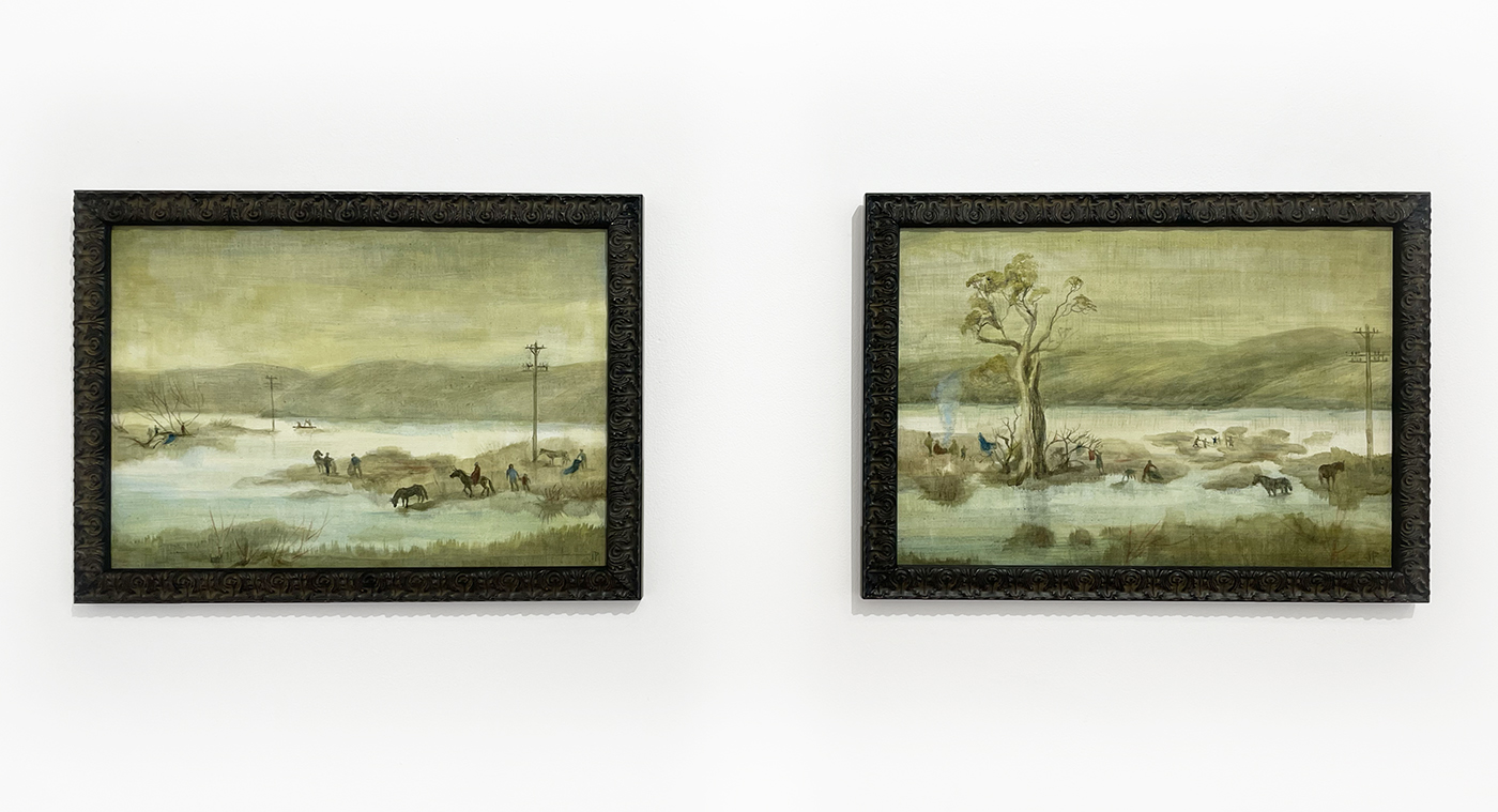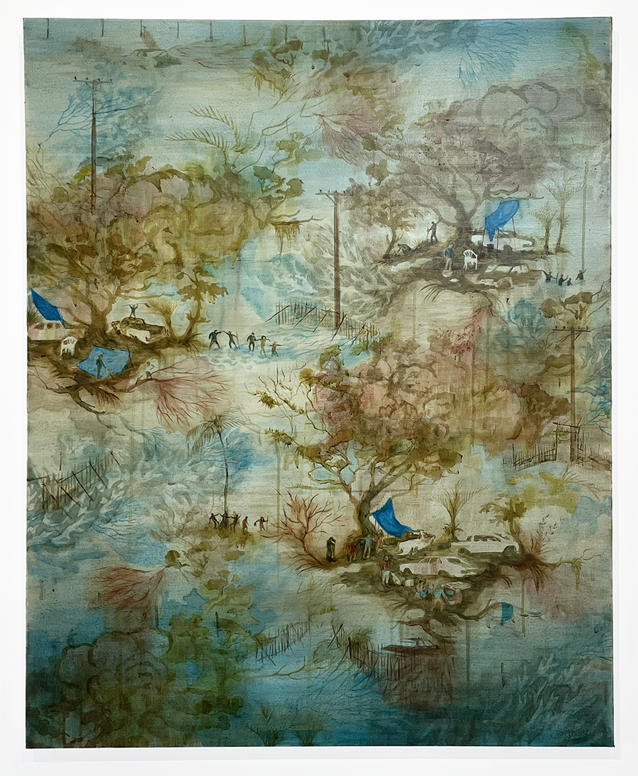 Paper Road is where I have been thinking about the future – in climate, politics, and relationships – and about recorded history versus storytelling. The paintings are of invented locations, with imagined figures drawn in part from art historical images, personal archives and news reportage. Paper Roads speak to potential and are legally accessible to all, but where I live they often look like private property, sometimes blocked off by fences or padlocked gates.
