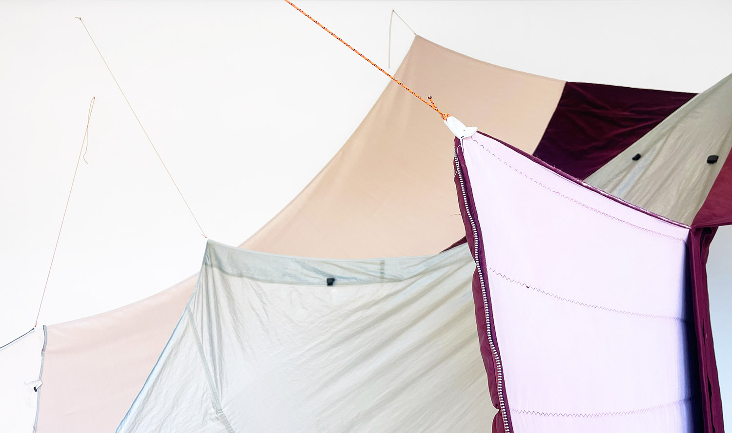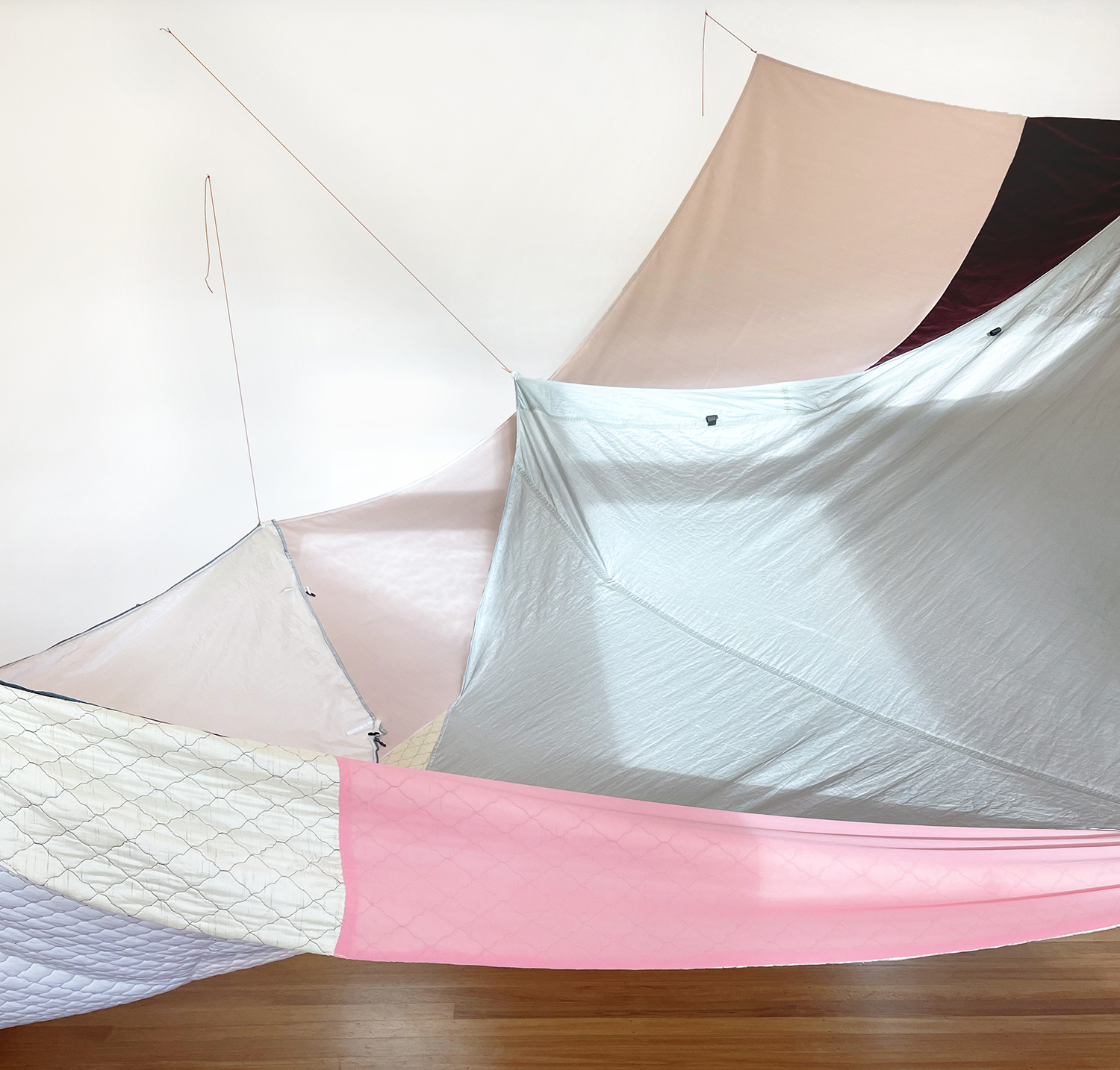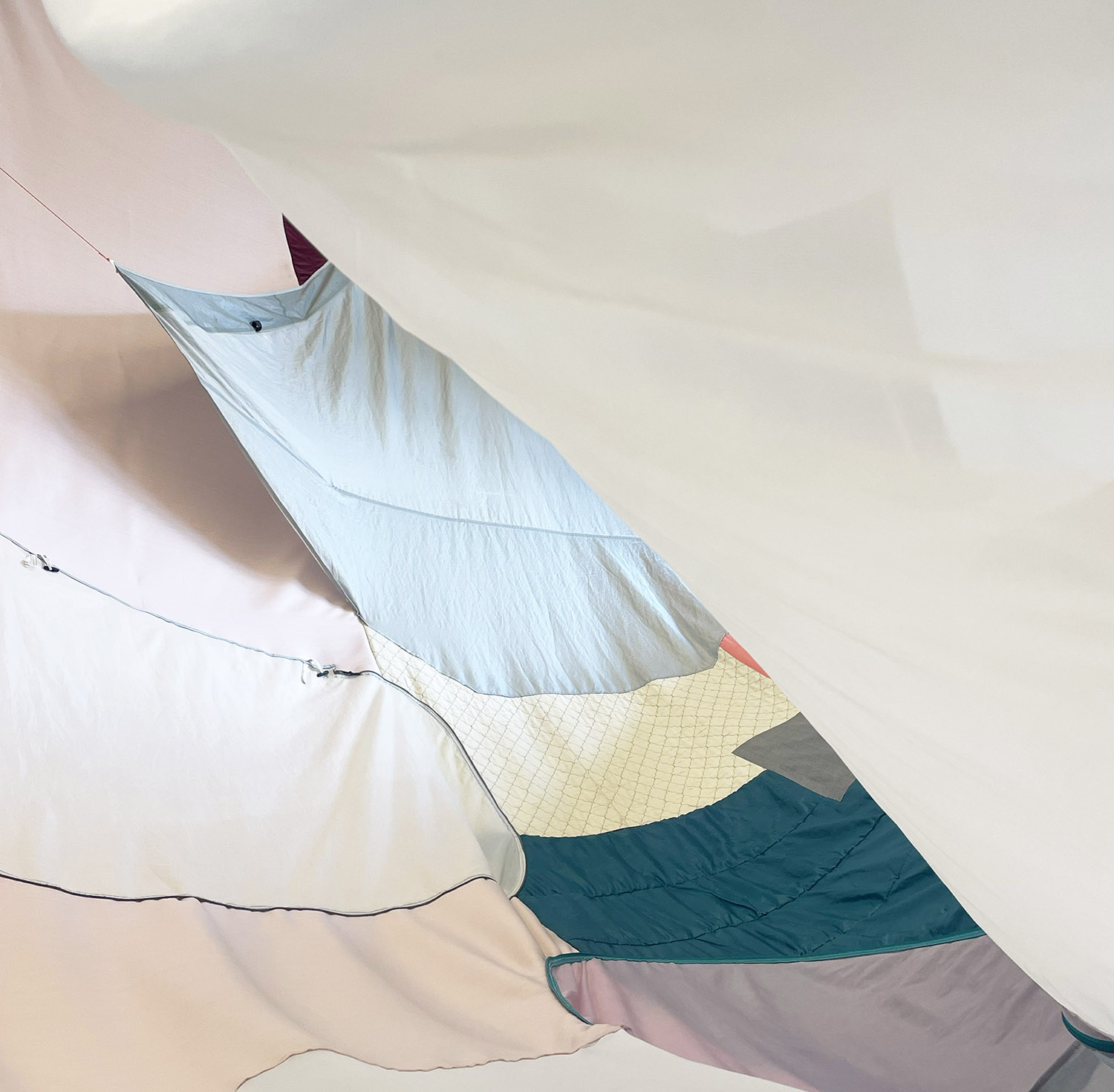 Gestaltwandler, 2025, tent fragments, sleeping bags, curtains, blankets, clothing, duvet cover, webbing, cord, thread