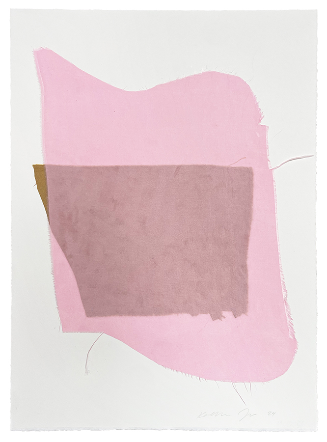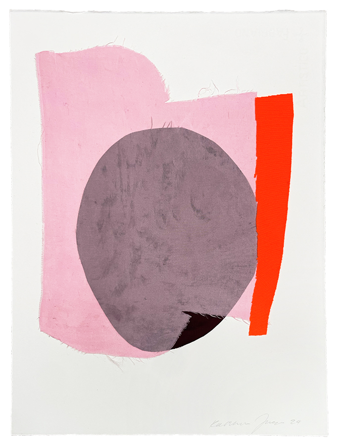 Carapace follows on from Scaffold, an installation Katharina Jaeger presented in a former warehouse in Ōhinehau Lyttelton late in 2024. In this new installation she adapts her flexible sculptural work to a more intimate space. For Jaeger, the fabrication of her pieces is only a starting point. The work needs the structure of an existing space to facilitate transformation and come alive. The main piece in Carapace is Gestaltwandler (shape shifter), an expansive construction of multi-coloured fabric which Katharina has stitched together to make a single large work. It is stretched with orange cord to connect the four walls of the main gallery space. This work is activated by the wanderings of the viewer who experience it in a spatial as well as a visual sense. Accompanying Gestaltwandler are four drawings entitled Fragment that collage cut fabric onto paper in freely composed abstractions.