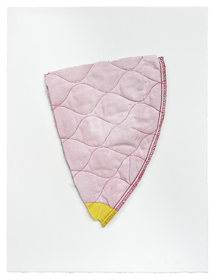Carapace is a body of work I started developing during the pandemic. At the time I was questioning how I could sustain a sculpture practice without a specific destination for my work. This led me to making portable and tactile sculpture that had the capacity to be unfolded into large assemblages and thought of as protective layers. I sew together and overlay textiles from tents, sleeping bags, clothing, blankets, duvets and curtains. Collecting my raw materials is an ongoing and confronting process. It is where I begin. Objects and materials with a close relationship to the body continue to find their way into my practice.