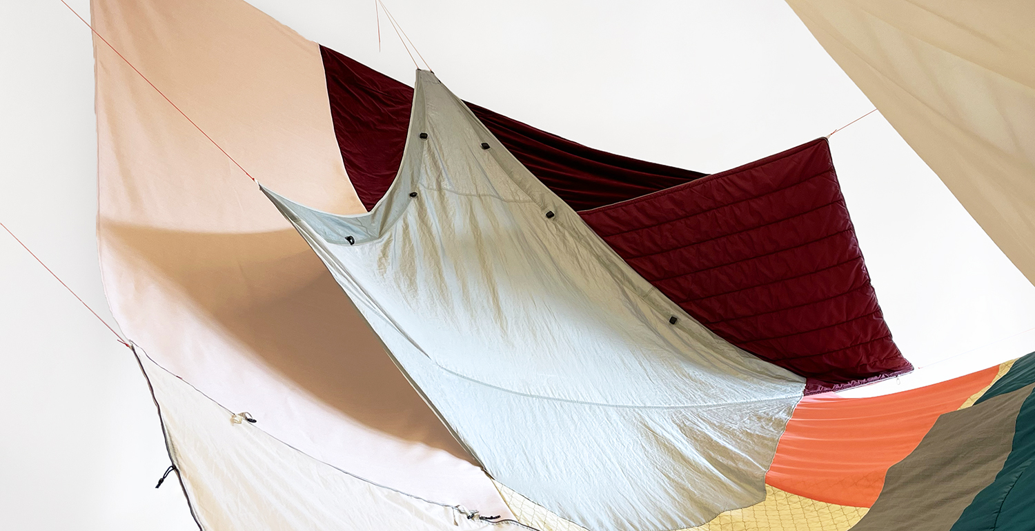 Gestaltwandler, 2025, tent fragments, sleeping bags, curtains, blankets, clothing, duvet cover, webbing, cord, thread Carapace is a body of work I started developing during the pandemic. At the time I was questioning how I could sustain a sculpture practice without a specific destination for my work. This led me to making portable and tactile sculpture that… View more