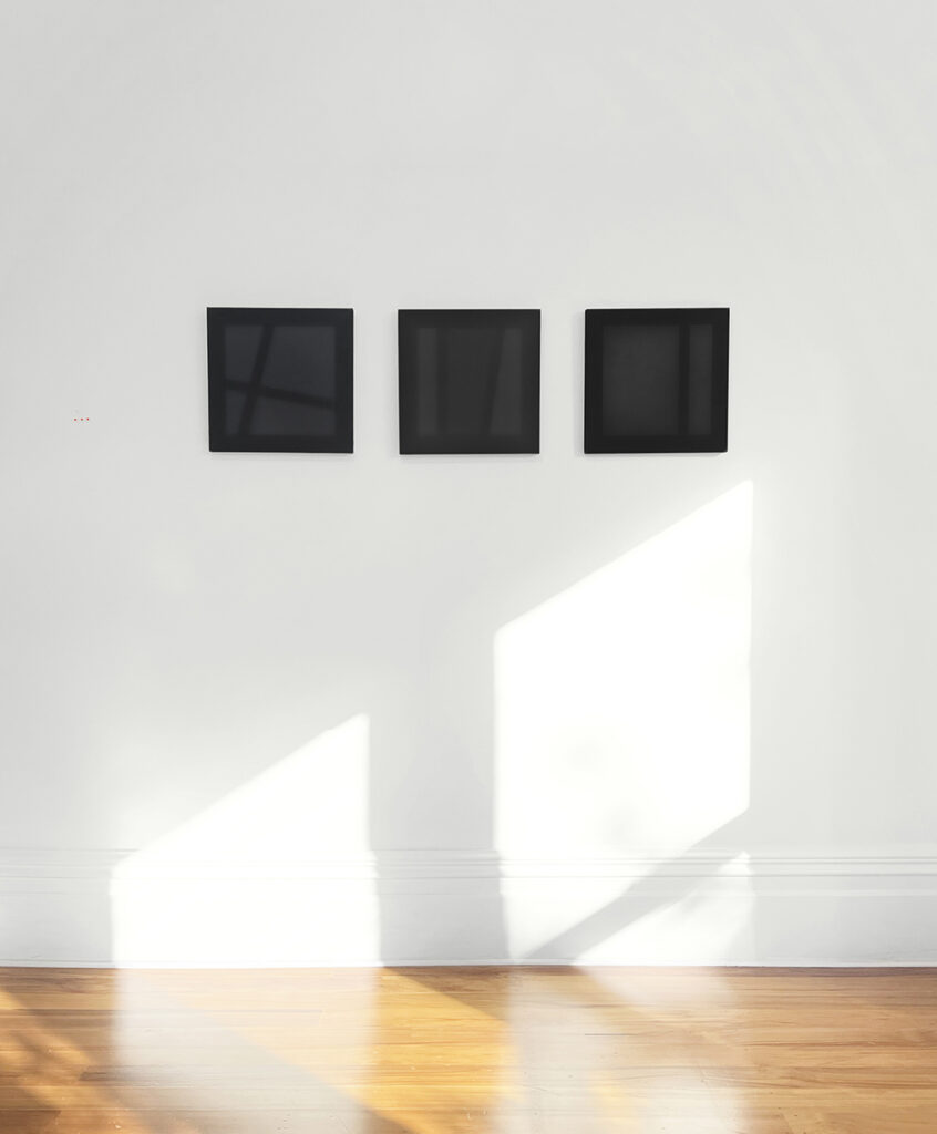 Shades of Black #1, Polly Gilroy, 2022, Silk, chiffon, on pine, 360 x 360mm, (SOLD)   Shades of Black #2, Polly Gilroy, 2022, Silk, chiffon, on pine, 360 x 360mm, (SOLD) Shades of Black #3, Polly Gilroy, 2022, Silk, chiffon, on pine, 360 x 360mm, (SOLD)