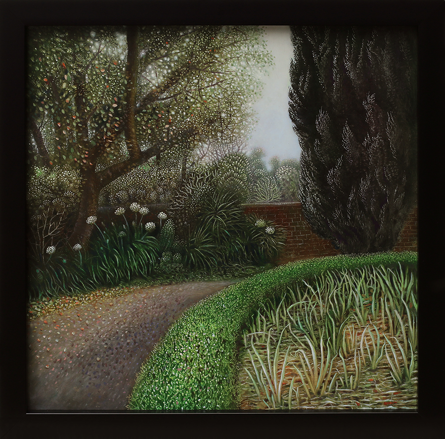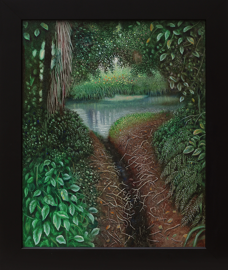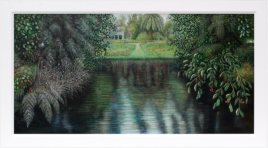 The night burned dark and a pair of courting birds sped past, disappearing with a whoosh into foliage. The paintings of Rebecca Harris inspire narrative. She tells us no story – there are no characters, no beginning, no end – but she sets the scene for a tale one might tell oneself. They invite entry. One could tread the paths, dampness might cling to one’s clothing. One might be tempted to eat the berries but are they poisonous? These paintings are visceral – one could taste, feel, smell them – but they are also otherworldly. Though based on specific places Harris presents the world as we have never actually seen it, not in waking hours at least. It is more like a dreamscape.
