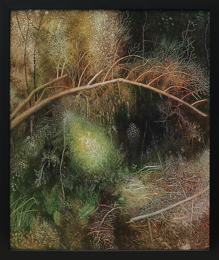 Her use of oil paint is sensuous and skilled. Beautifully rendered detail and pinpricks of colour overlay oily fields of loose underpainting that have often been scribed with the hard end of the brush for linear expression. This new body of work marries medium and vision with dexterity and ease.