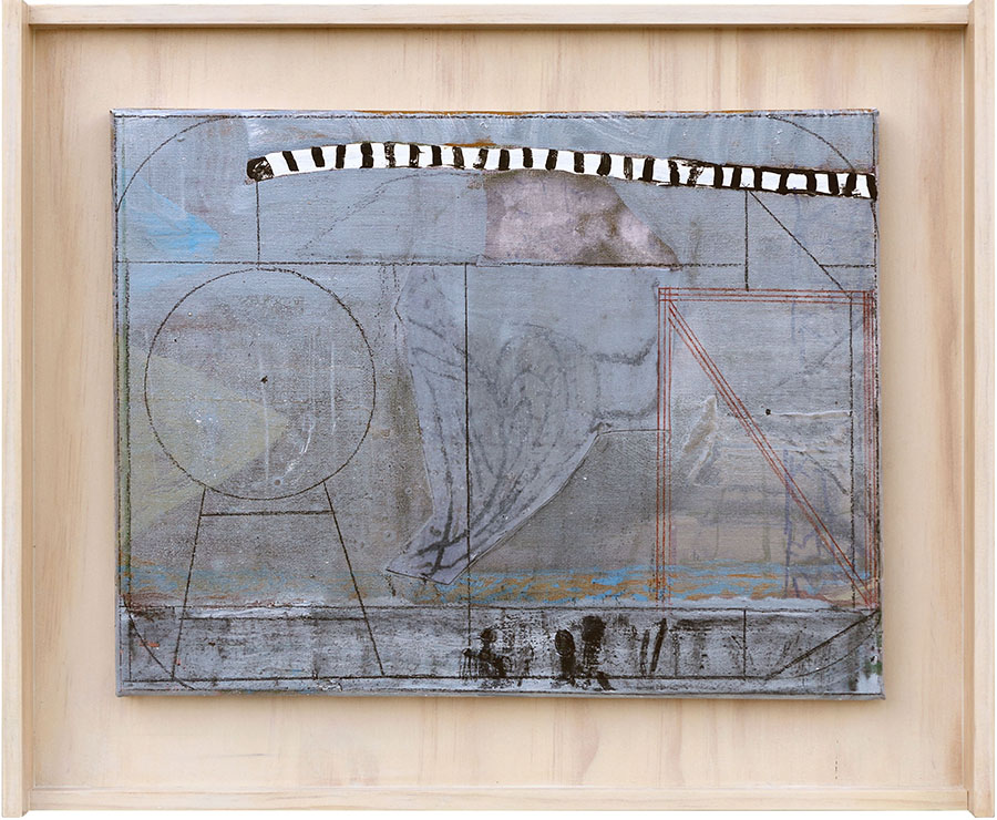 In the A whiter shade of pale series, paint and charcoal create their own rhythms over a surface of inlaid linoleum and wood, each piece elegantly delineated, cut out, fitted in. The paint unifies the surface. In others, such as The moment before silence paintings he has worked straight on to canvas to produce moody images evocate of remembered experience. The Ruskin Street series are studies, seriously playful in intent, explorations towards future work.