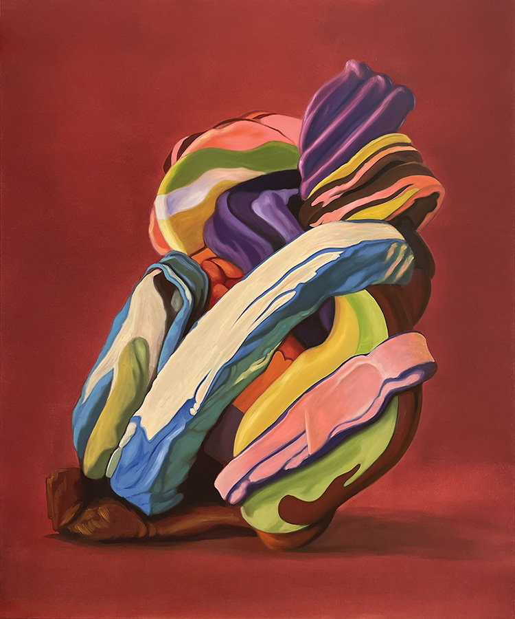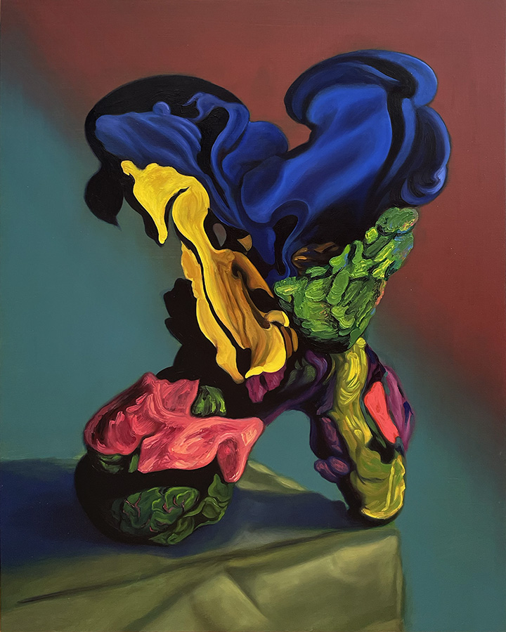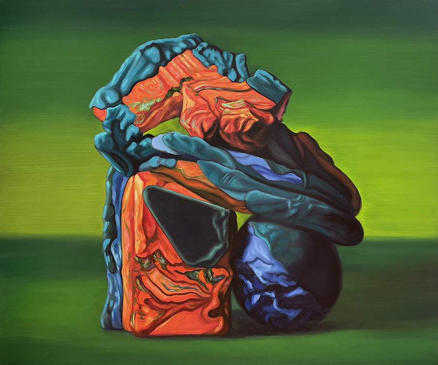 Thomas Hancock’s exhibition Mass in Flux is a new series of oil paintings that lean into process-based methods to explore abstraction. He began these works by sculpting, photographing and digitally manipulating forms that became ‘models’, then employing his skills in still-life painting to depict solitary objects in fictional spaces.