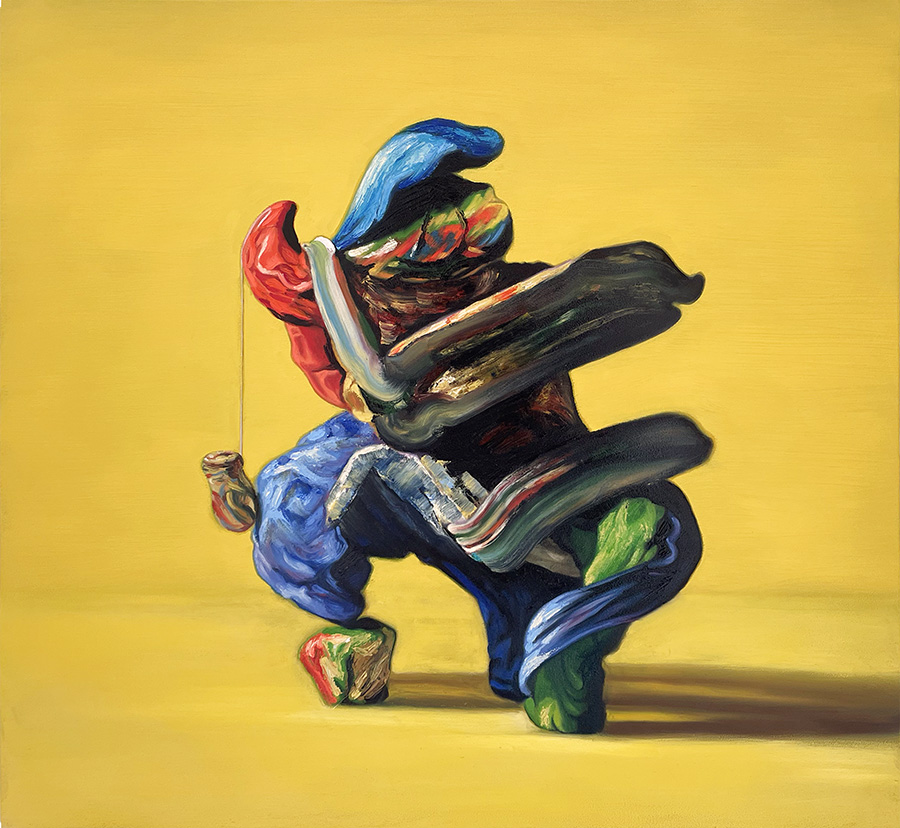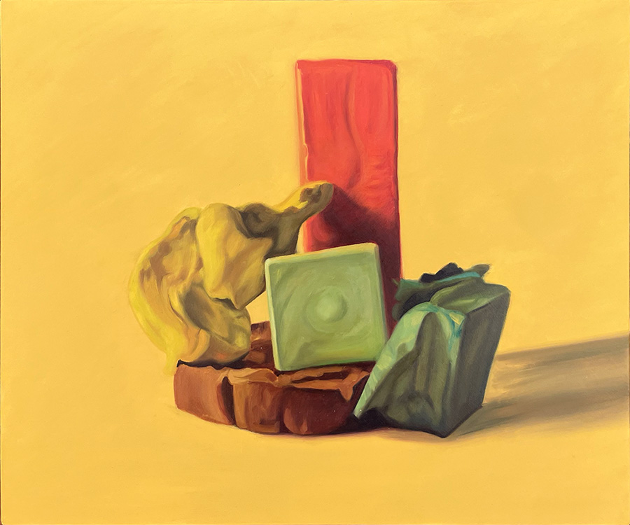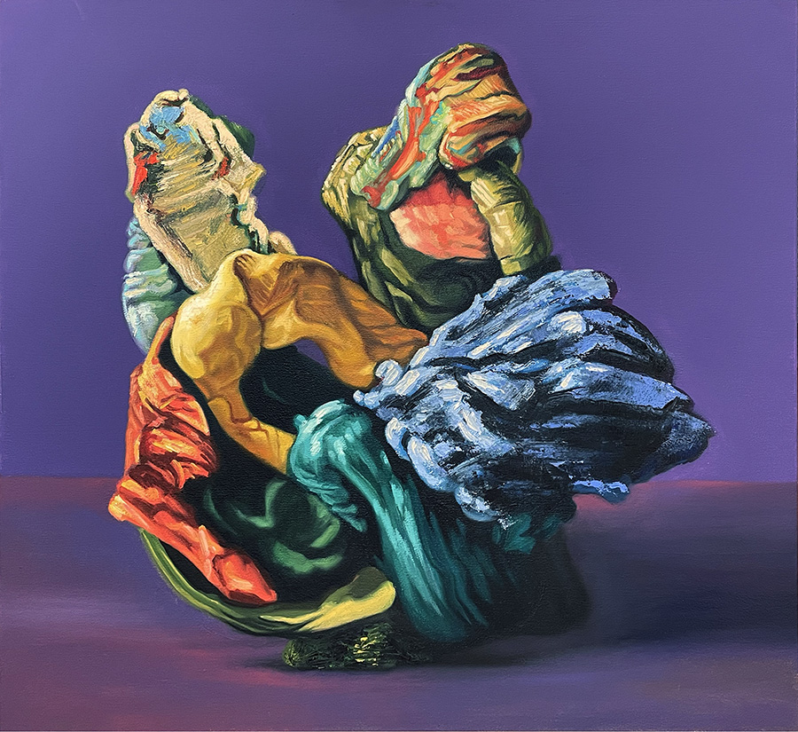 ‘I employ chance and happenstance in conjunction with a critical eye when creating my subject matter. The subjects of my paintings are not permanent, finished objects, but rather created specifically to be in a painting, and then destroyed, sometimes repurposed into new constructions. Due to the impermanence of the materials I use, I am able to continuously manipulate these constructions throughout the photography process. Finally, through digital manipulation I can finalise my blueprint for the eventual painting, applying and adjusting colour, composition etc. In essence I am creating a figurative painting of something that exists, or has existed, and imbuing it with qualities of something abstract or imagined.’
