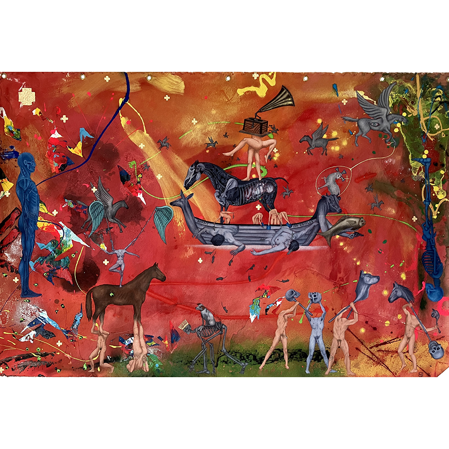 acrylic, oil, schlag metal, spray enamel on unstretched canvas