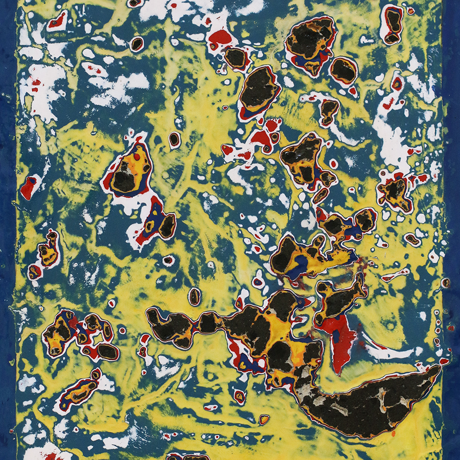 Enamel, sand, varnish, detritus on ply 450 x 350 x 45mm