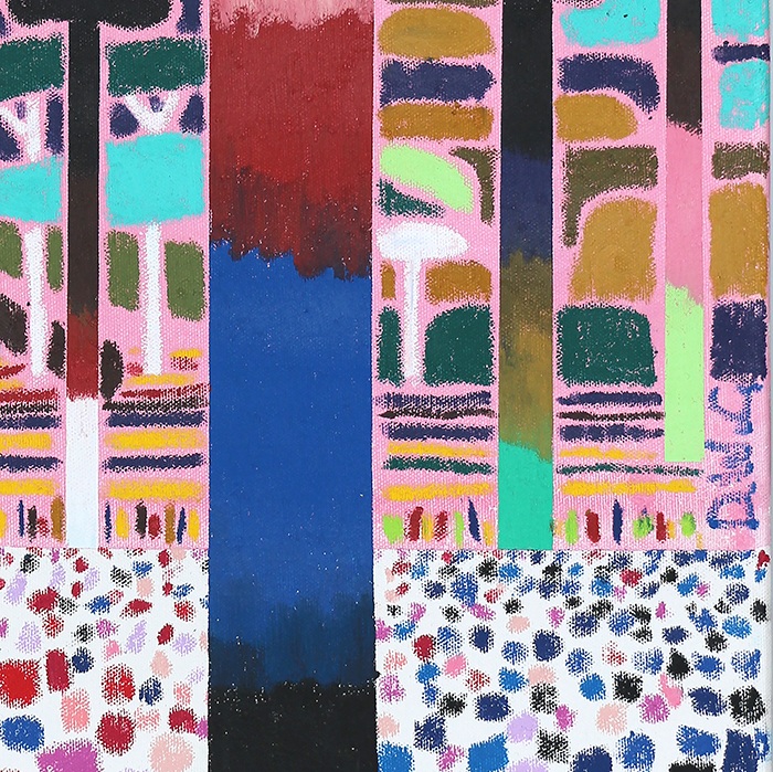 Oil pastel and acrylic on canvas, framed.