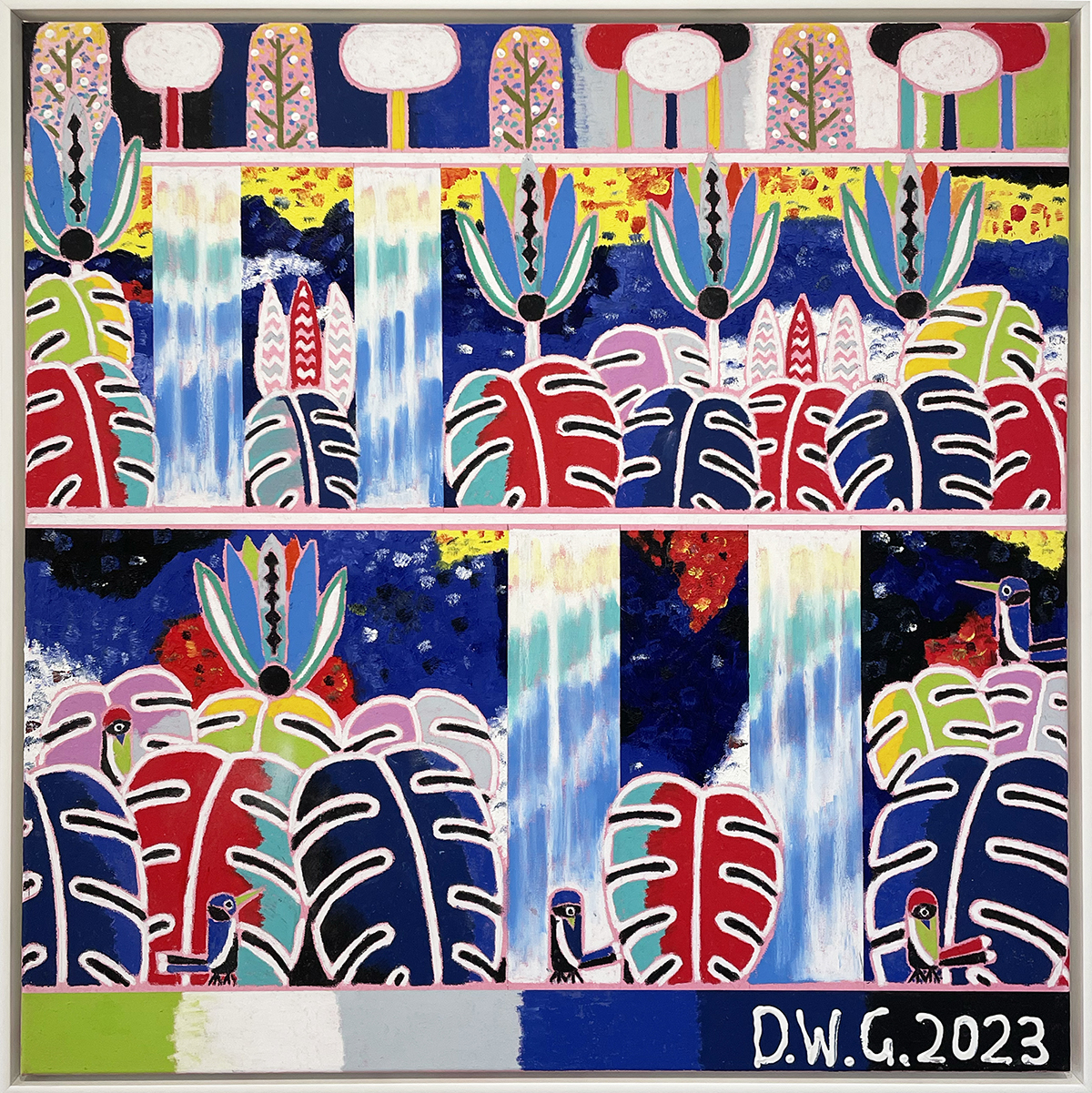Oil, oil pastel and acrylic on canvas, framed.