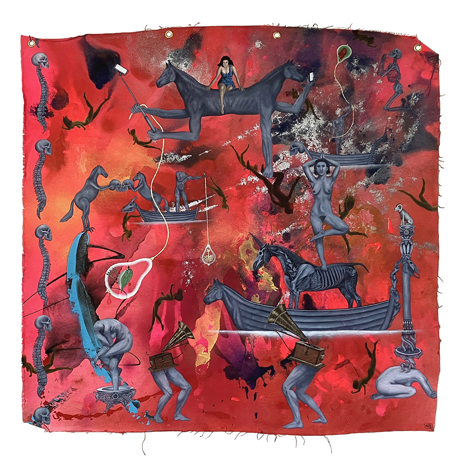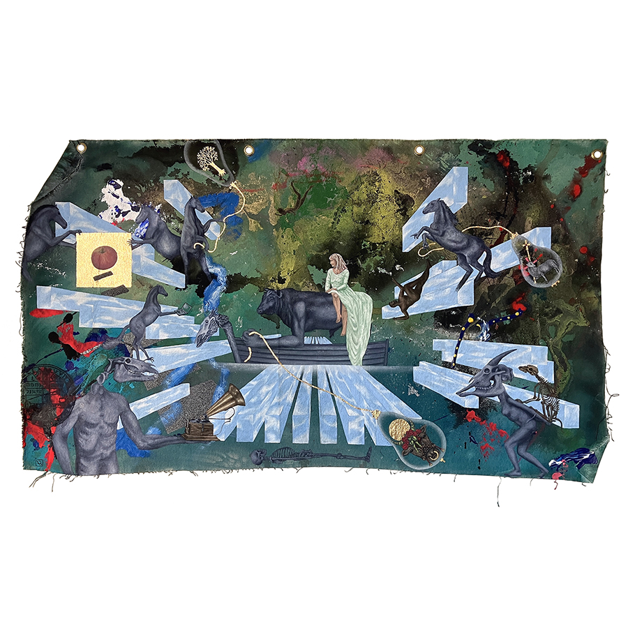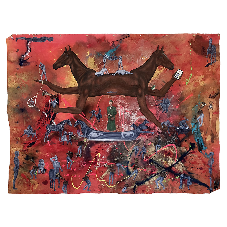Influenced by music, stories, poetry, history, and generously seasoned with the absurdist philosophy of Albert Camus, Andrew meticulously layers detailed figurative forms over loose grounds. These backgrounds are vividly saturated with a mixture of thin washes and thickly applied gesture giving a tactile quality to the work. Each painting reveals its own internal truths, free from the constraints of physics or the natural laws of the material world.
