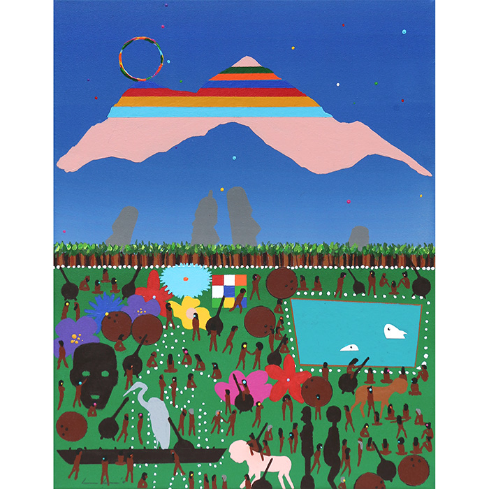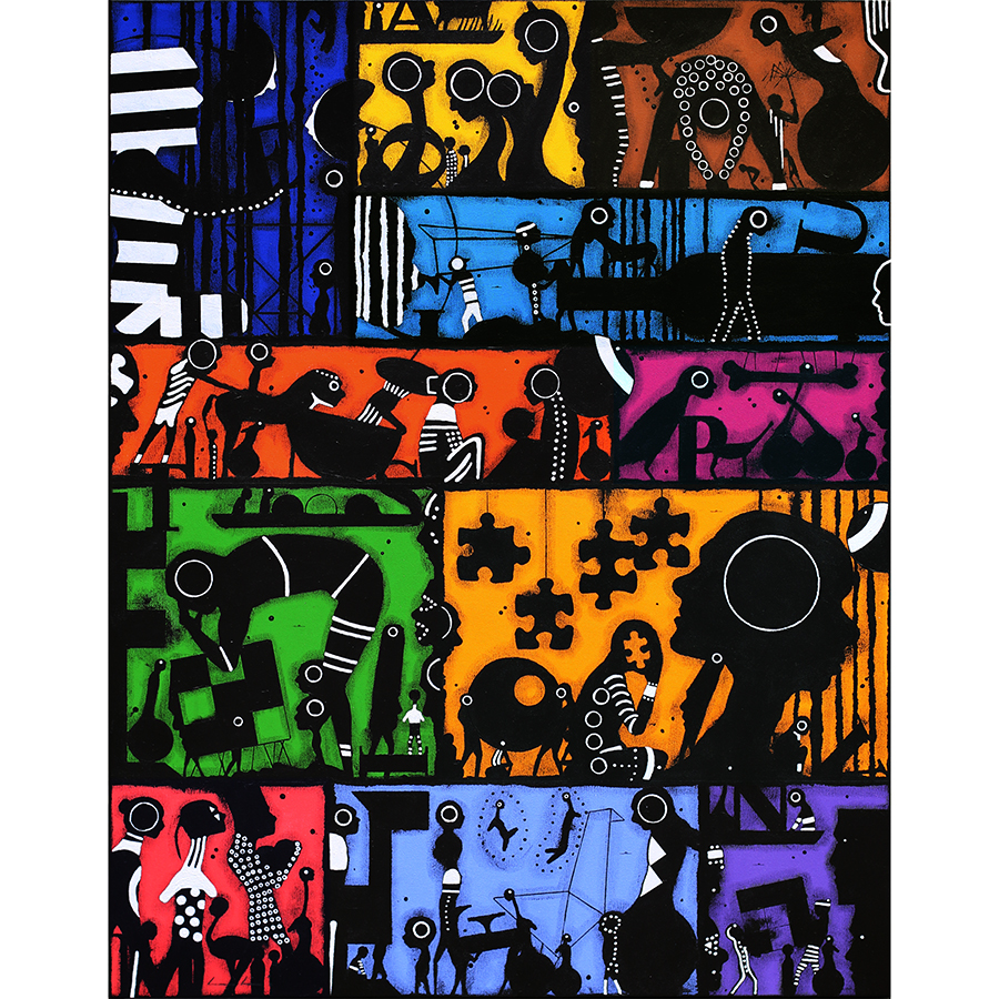 Andy Leleisi’uao is one of the most significant Pacific artists working in New Zealand today. His paintings are rich in personalised mythology and tell an open-ended story. Early work was influenced by comic strips and visual narrative has remained an important aspect to Leleisi’uao’s practice. His unique iconography is fantastical and imaginative. He often incorporates puzzle pieces, crosswords and Rubik’s cubes, giving the impression that his figures are attempting to make sense of things. His work frequently references social problems and cultural complexity. “Andy’s prescient talent for seeing who we are, what we are like and what we do is a signature of his art.” (Ron Brownson 2009)