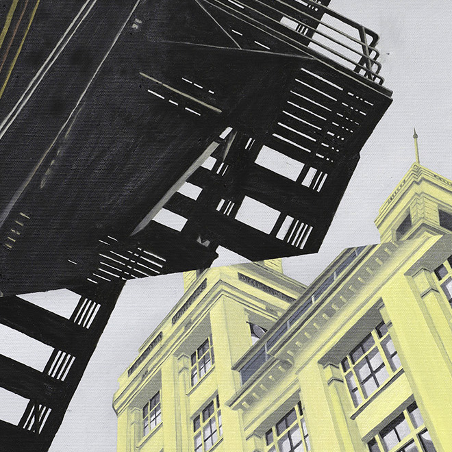 Pole’s practice shows a commitment to the investigation of both landscapes and cityscapes, using his own photographs as a starting point, but disrupting the spaces depicted to reveal the vagueness of human perception and invoke notions of falsehood and  fragility. As Felicity Milburn explains, “By adopting an abruptly flattened perspective, Pole reframes a meticulously rendered cityscape as an oscillating wall of pattern and texture…As his painted city surges in front of us, it seems ready to break apart into fragments of pure colour, forming a strangely dislocating threshold that has as much to do with imagination and memory as with visual fidelity”
