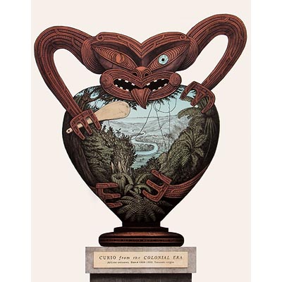 It was while making Mythical Landscapes that she first set Greek mythology in the New Zealand landscape. Maguire extended this idea further in Southern Myths (2002), a series of nine etchings threaded on an adapted plotline from Homer’s Iliad. In the next series of lithographs, The Odyssey of Captain Cook (2005), the Endeavour became the vehicle by which the ancient Greeks collided with resident Māori. In The Labours of Herakles (2008) the archetypal Greek hero is cast as New Zealand pioneer and proceeds to colonise the new land. In Titokowaru’s Dilemma (2011) the action shifts to the land wars of South Taranaki in the late 1860’s.
