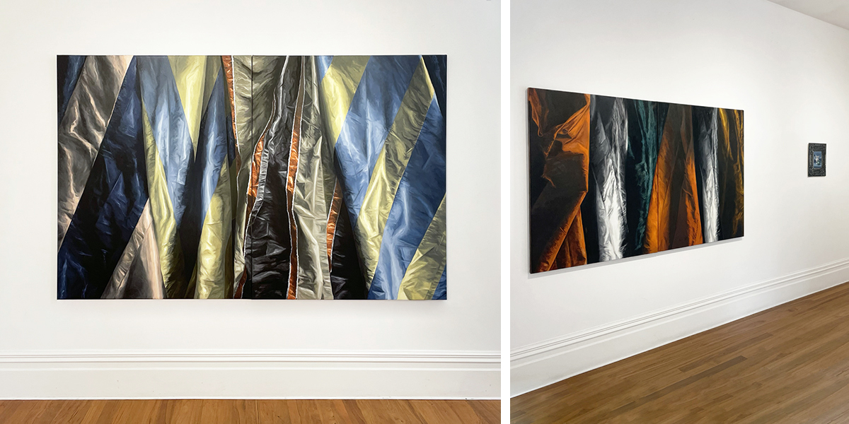 In this colourful exhibition Nigel Buxton presents paintings in the tradition of trompe l’oeil. These works, at first glance, persuade us to accept illusion. Paint modelled on flat surface tricks us, for a moment, into believing we see drapery in three dimensions. The flops and folds of fabric curve sensuously in and out of shadow or march with forthright authority across the picture plane.