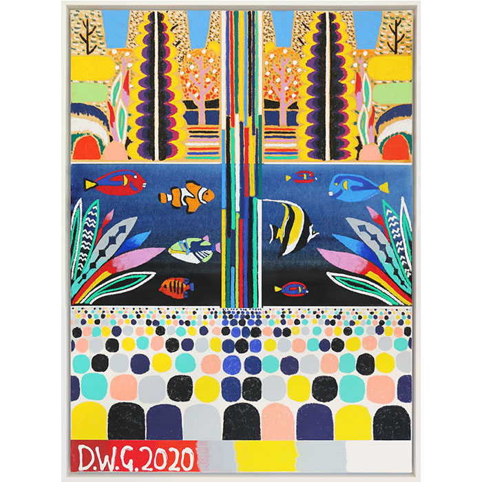 Oil pastel and acrylic on canvas, framed.