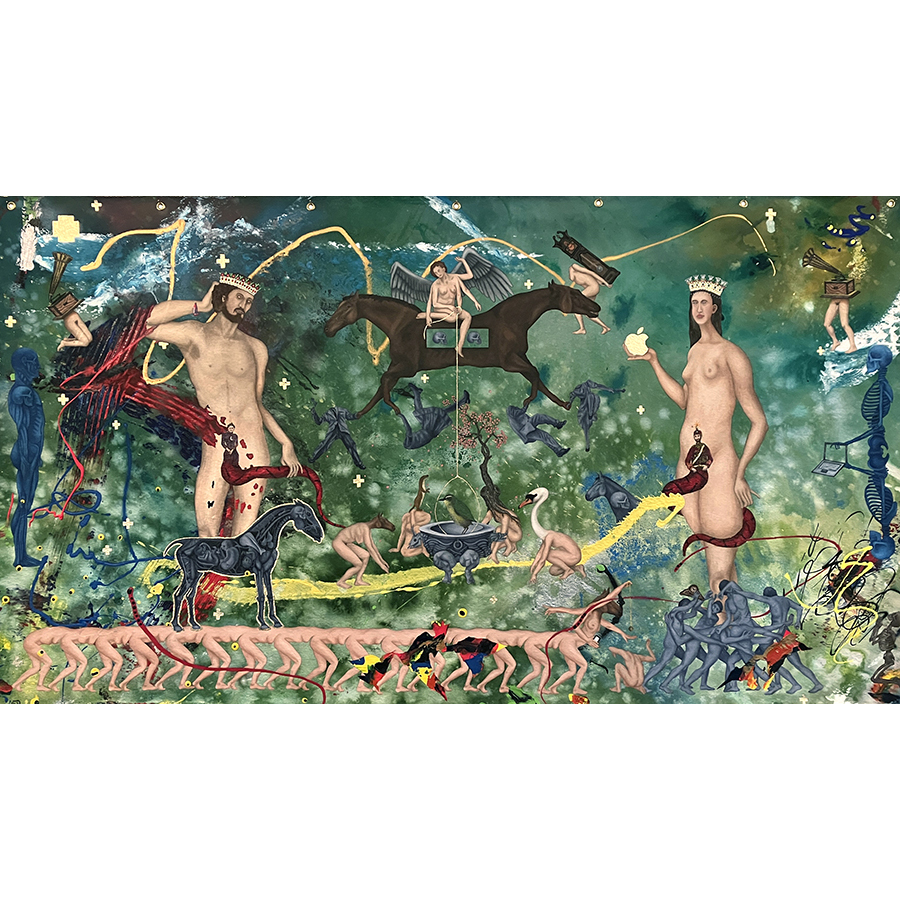 Influenced by music, stories, poetry, history, and generously seasoned with the absurdist philosophy of Albert Camus, Andrew meticulously layers detailed figurative forms over loose grounds. These backgrounds are vividly saturated with a mixture of thin washes and thickly applied gesture giving a tactile quality to the work. Each painting reveals its own internal truths, free from the constraints of physics or the natural laws of the material world.