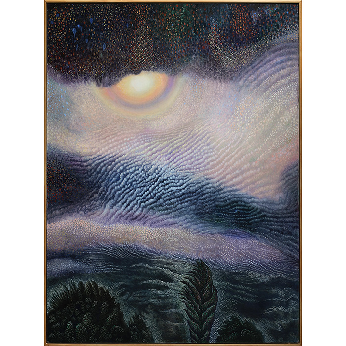 With imaginative flair, Rebecca Harris invents pictorial worlds and invites us to explore them. Her use of oil paint is sensuous and skilled. Beautifully rendered detail and pinpricks of colour, overlay oily fields of loose underpainting, scribed with the hard end of the brush for linear expression. At times, her paintings are almost sci-fi in their strangeness; at other times she reflects nature more precisely. But always, her own imagination and the acuteness of her viewing inflect the mood.